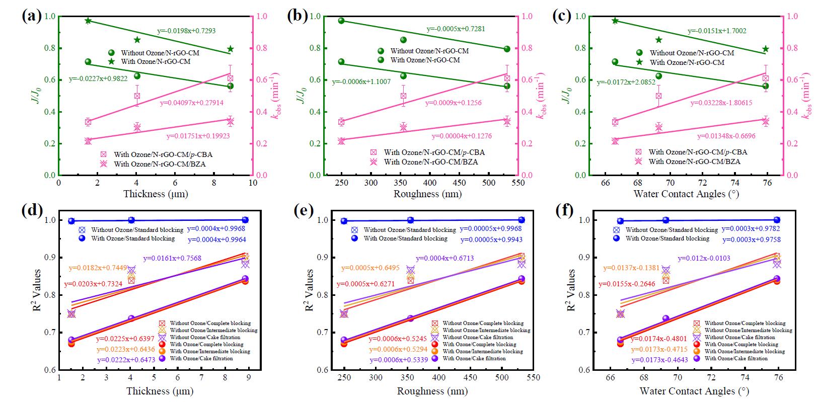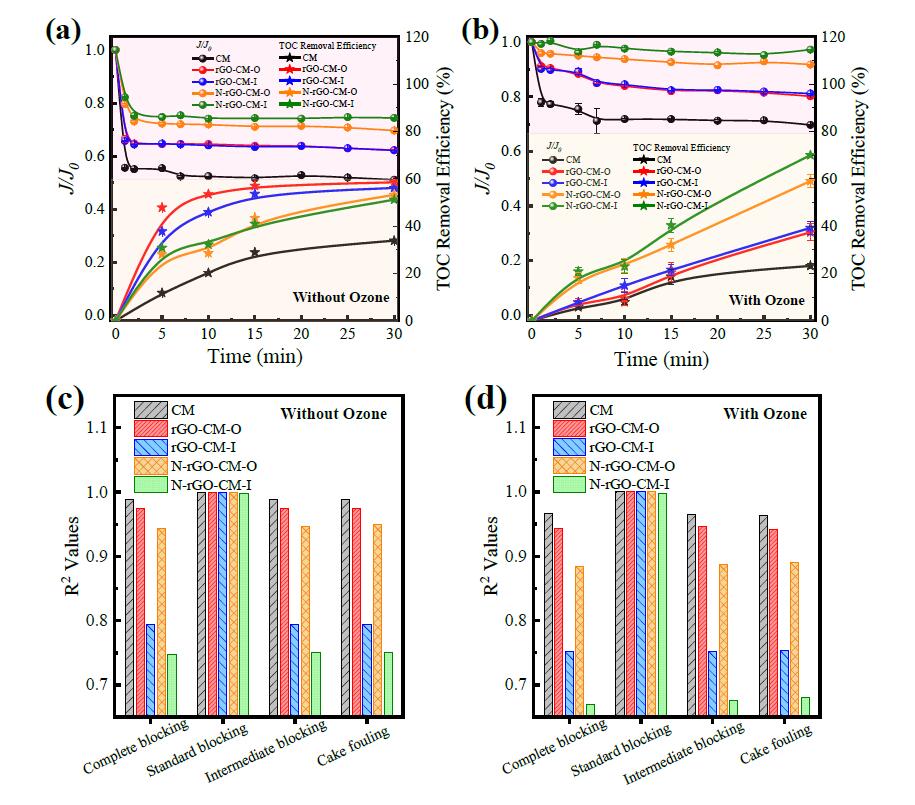 抗膜污染是催化膜协同性能的另一种表现。结果表明,在N-rGO-CM-I过滤过程中,J/J0与上述三种界面特性呈负相关关系,表明提高N-rGO-CM-I的界面属性对抗膜污染性能是有负面影响的。更厚更致密的催化层将导致水和SA之间的传质阻力增加,导致抗膜污染活性降低。之前的研究也表明,更光滑的表面减少了污染物在CM表面的积累,减少了膜污染的形成。因此,N-rGO-CM-I的粗糙表面导致抗膜污染性能降低。更有趣的是,先前的研究表明,增加膜疏水性有望减少亲水性SA在膜表面吸附所引起的污染,因此,预期结果是疏水性与J/J0呈正相关关系。这一矛盾归因于由于层厚和粗糙度的增加导致抗膜污染性能的降低程度远高于疏水性增加导致抗膜污染性能的上升程度。与此同时,N-rGO-CM的防污活性优于rGO-CM被进一步证实,由于N-rGO-CM更薄、更疏水的催化界面。