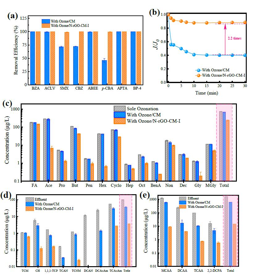 此外,引入香蕉视频下载增加了膜的协同去污和自清洁性能,但可能增加有毒副产物(如酮醛)的形成。在单香蕉视频下载氧化后形成的14种酮醛的总浓度为746.87 mg/L。主要副产物为FA(183.21 mg/L)、Ace(292.71 mg/L)和But(111.27 mg/L),其次为Hex(42.85 mg/L)和Cyclo(71.18mg/L)。这五种酮醛的总和构成了这类有毒副产物的90%以上。此外也发现了Gly(1.29 mg/L)和Mgly(11.33 mg/L)这两种可能的致突变化合物。CM耦合香蕉视频下载能够部分降低酮醛的形成(总浓度为684.53 mg/L)。这些微量的降低主要是由于[Pro]、[But]、[Hep]、[OCT]、[BenA]和[Non]的减少所导致的。与CM耦合香蕉视频下载结果不同,由于N-rGO-CM-I的更加先进的界面催化性能,N-rGO-CM-I的酮醛([总酮醛]=243.90 mg/L)的形成明显减少。这一下降主要是由于Hex降低98.5%,Ace的形成降低97.7%,But的形成降低62.1%以及Cyclo的形成降低60.0%造成的。