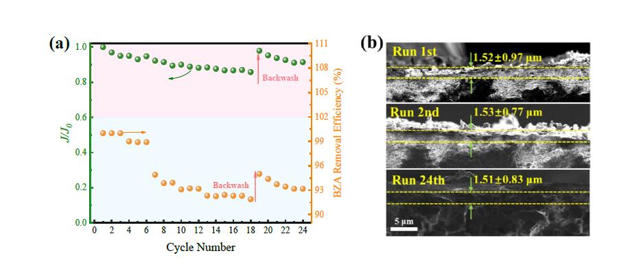 如图6所示。由于N-rGO被均匀锚定在陶瓷膜表面,形成均匀的高性能活性中心。使得N-rGO-CM-I在微污染物去除和膜自清洁方面表现出优异的稳定性。N-rGO-CM-I在使用18次之后,依然保持较高的自洁性能和BZA去除性能。用水反冲洗后,N-rGO-CM-I的水通量恢复到初始水通量的97%,在接下来的过滤周期提供了高的水通量。反洗过程中活性中心吸附的降解产物被去除,反洗后对微污染物的催化活性大部分恢复。此外,催化层与CM之间的牢固程度也是不容忽视的。如下图中的SEM表征结果,清晰地观察到N-rGO牢固地负载在CM表面,经过多次使用之后,催化层厚度没有明显的变化。这使得N-rGO-CM-I在微污染物去除和膜自清洁方面表现出稳定有效的协同性能,表明其在可持续地处理废水过程中对于污染物去除方面的实用性,并且在这个过程中,有毒副产物的形成得到了有效地缓解。