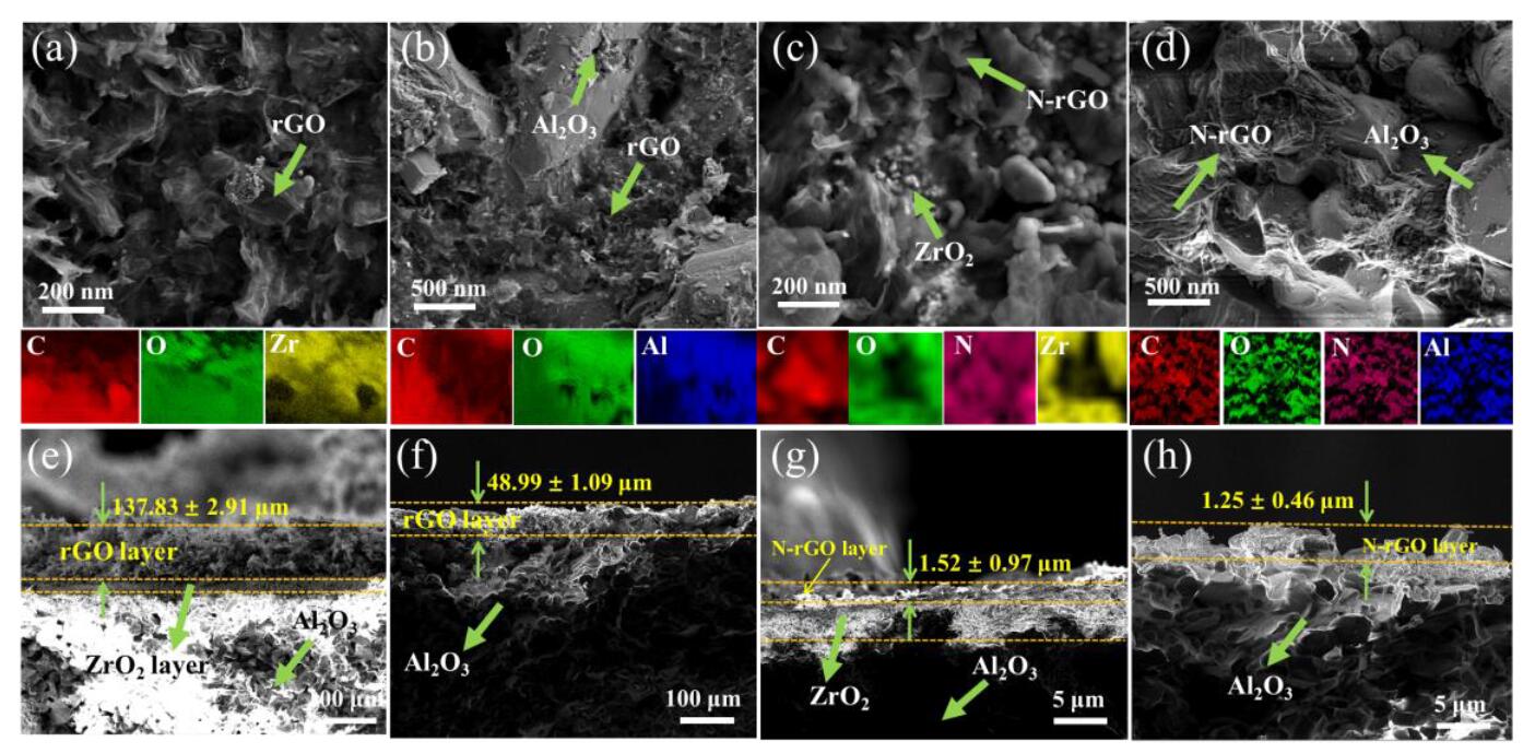 (a)rGO-CM-I、(b)rGO-CM-O、(c)N-rGO-CM-I以及(d)N-rGO-CM-O;石墨烯基陶瓷膜截面的SEM-Mapping表征结果(e)rGO-CM-I、(f)rGO-CM-O、(g)N-rGO-CM-I以及(h)N-rGO-CM-O