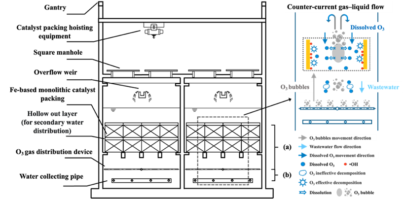 Fig. 4. Schematic of the reinforced concrete construction reactor, (a) the distance from catalyst packing to O3 gas distribution device and (b) the distance from O3 gas distribution device to water collecting pipe. Copyright 2023, Elsevier Inc.