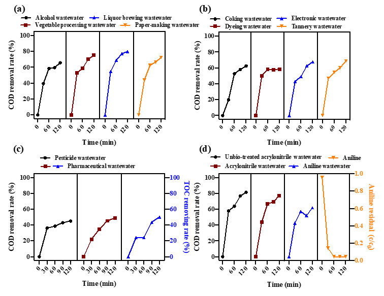 Fig. 5. Fe-based catalysts catalytic ozonation of different industrial wastewater after biochemical treatment, catalysts dose: 200 g/L, gas flow rate =1 L/min, gaseous O3 concentration =54.7 mg/L. Copyright 2023, Elsevier Inc.