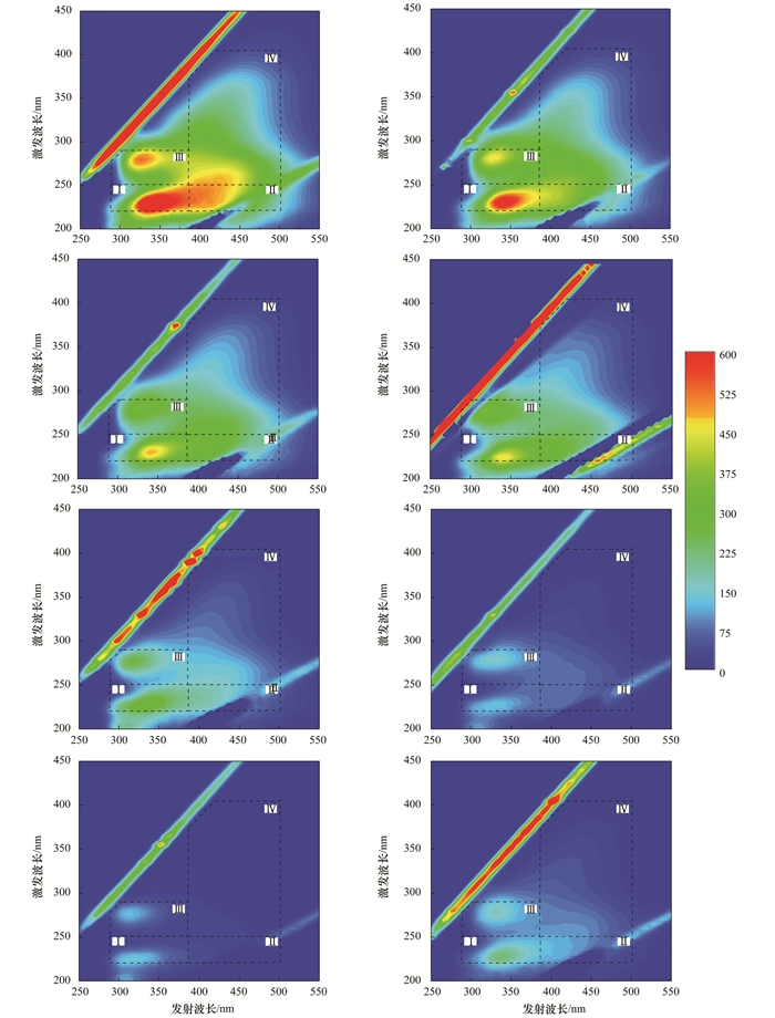 不同香蕉视频下载浓度条件下香蕉视频下载和BAC出水荧光特征如图1所示.在无香蕉视频下载的条件下, 香蕉视频下载出水(同砂滤出水)荧光区域主要由蛋白类物质(区域Ⅰ)、富里酸类(区域Ⅱ)、微生物代谢产物及其类似物(SMPs)(区域Ⅲ)和腐殖酸类(区域Ⅳ)等物质构成, 利用区域积分法对荧光区域进行计算, 4种荧光物质分别占总荧光区域的37.54%、28.43%、6.41%和27.62%.经过BAC过滤之后, 4种物质的荧光强度分别降低18.51%、75.21%、38.75%和27.42%, 表明BAC对水中的特征有机物有一定的去除能力.但代表蛋白质类的荧光组分与香蕉视频下载出水相比仅下降了18.51%, 表明水中难降解有机物和亲水性物质(蛋白类物质)无法在BAC过程中得到高效去除, 这可能是BAC在不通香蕉视频下载条件下DOC去除效果一般的原因.在香蕉视频下载浓度为0.5、2.0和4.0 mg·L-1条件下, 香蕉视频下载出水的总荧光强度与无香蕉视频下载相比分别降低54.89%、72.84%和88.64%, 表明水中的特征有机物在香蕉视频下载条件下可以得到高效去除.