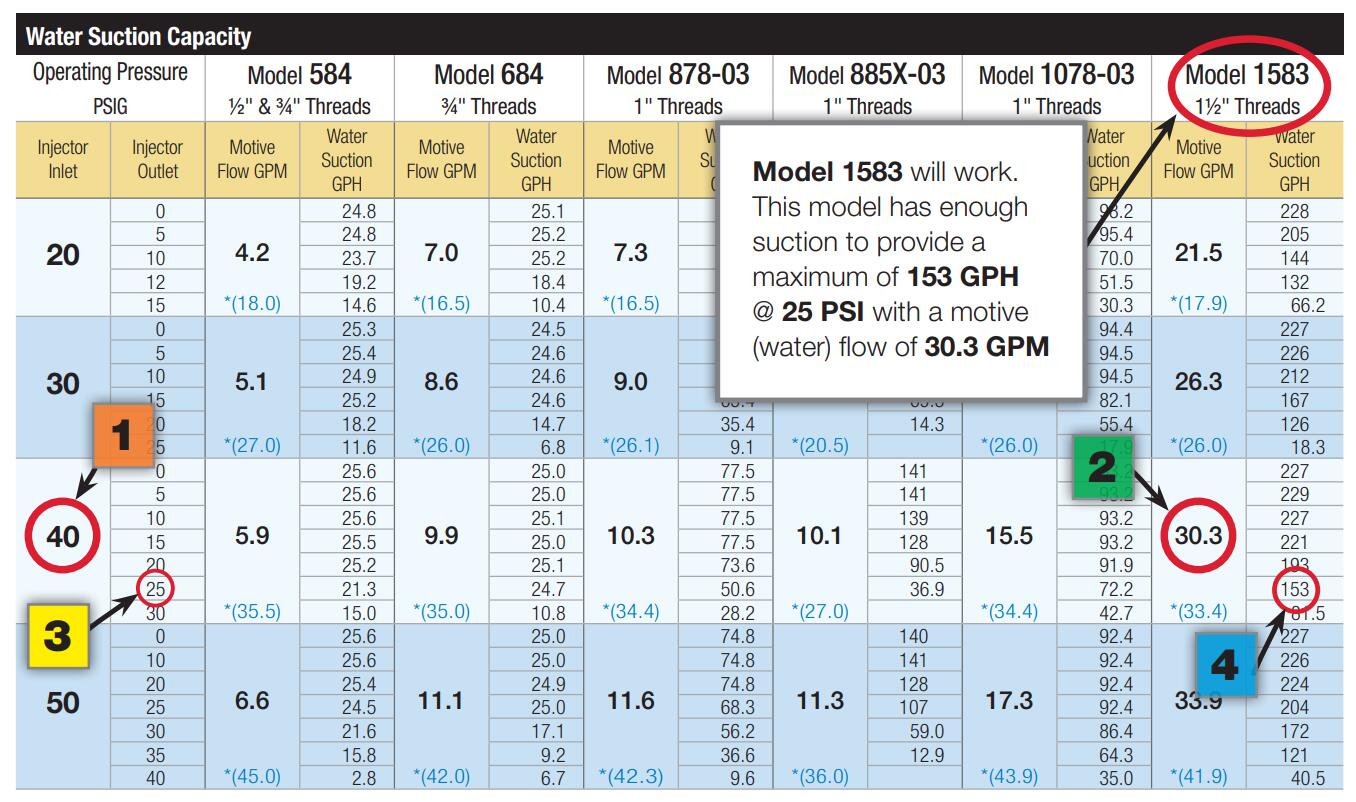 一位种植者计划通过旁路向他的灌溉系统注入120 GPH(2 GPM)的液体肥料。他有40 PSI可用,下游需要保持25 PSI。他还希望通过旁路的水流量保持在每分钟30加仑左右。根据种植者的要求,请参考下面的注入器性能表: