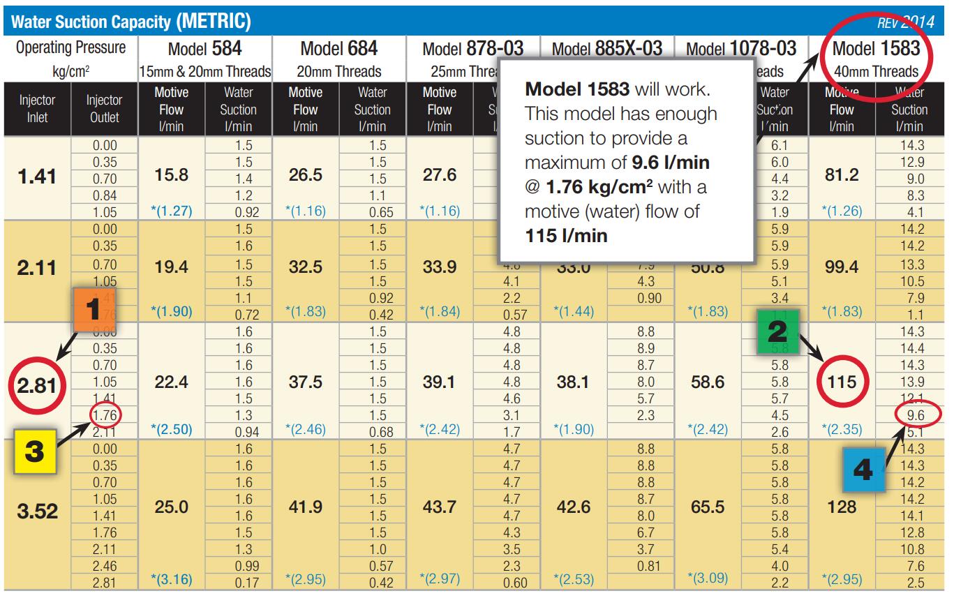 一位种植者计划每分钟通过旁路向他的灌溉系统注入7.57升的液体肥料。他有2.81 kg/cm2可用,下游需要保持1.76 kg/cm2。他还希望通过旁通的水流量保持在116升/分钟左右。根据种植者的要求,请参考下面的注入器性能表: