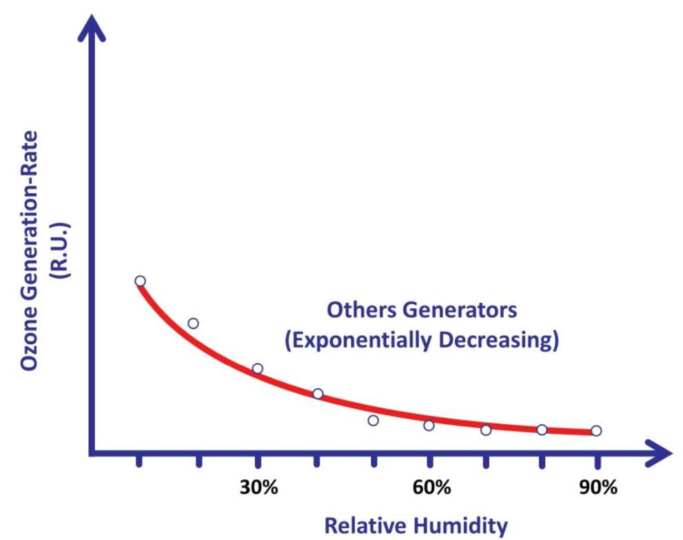 曲线显示了传统香蕉视频下载发生器(例如基于陶瓷板技术的香蕉视频下载发生器)的香蕉视频下载产生率,随着空气中湿度水平的增加,香蕉视频下载发生率呈指数下降。因此,这种传统的香蕉视频下载发生器对于在正常湿度条件下的处理实际上效率低下,这些湿度条件通常高于50%RH。